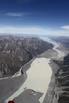 El río Tasman fluye hacia el sur 25 kilómetros a través del valle del Tasman en los Alpes del Sur y el lago glaciar Pukaki, formando esta parte final del río el proyecto hidroeléctrico Waitaki.