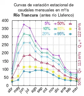 El caudal del río (en un lugar fijo) varía en el tiempo, por lo que existen varias formas de representarlo. Una de ellas son las curvas de variación estacional que, tras largos periodos de mediciones, predicen estadísticamente el caudal mínimo que lleva el río con una probabilidad dada, llamada probabilidad de excedencia. La curva de color rojo ocre (con ) muestra los caudales mensuales con probabilidad de excedencia de un 50%. Esto quiere decir que ese mes se han medido igual cantidad de caudales mayores que caudales menores a esa cantidad. Eso es la mediana (estadística), que se denota Qe, de la serie de caudales de ese mes. La media (estadística) es el promedio matemático de los caudales de ese mes y se denota .