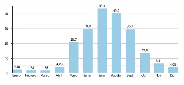 En lo que concierne al periodo estival (de junio a agosto), el caudal mínimo observado ha sido de 10.2 m³/s en junio de 1959.