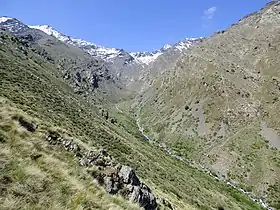 Así pues y de acuerdo con el Padre Ferrer,[3] se debe concluir que el río Valdeinfierno arranca en realidad del corral de su nombre y discurre en dirección NNE por entre el Tajo de los Machos, el Collado de Veta Grande, la Solana del Cardeal y la Arista de los Cuernos, que constituyen en la cabecera su margen izquierda, seguidamente recibe al primer y más relevante afluente de este mismo margen izquierdo, el Barranco Malo, y tras éste es la Loma del Lanchar su margen izquierda; mientras que por la derecha, es la Loma de Casillas la que constituye esta margen, que finaliza en la Majada del Palo, lugar donde confluye este río con el Río Valdecasillas, que viene por su derecha, al otro lado de dicha majada, conformando ambos desde aquí el Río Real. Aguas abajo, el Real se une con el río Guarnón, procedente del Corral del Veleta, y a partir de este punto se le conocerá como río Genil.