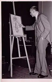 ![]() Raúl Schurjin brinda una demostración de pintura en vivo, durante su gira por Europa, en el vapor "La Argentina" (década de 1960) | ||
