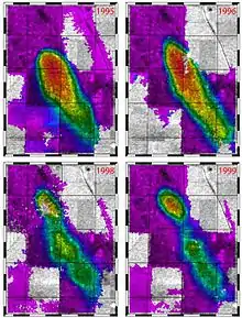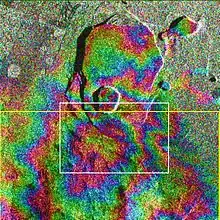 InSAR can be used in a variety of volcanic settings, including deformation associated with eruptions, inter-eruption strain caused by changes in magma distribution at depth, gravitational spreading of volcanic edifices, and volcano-tectonic deformation signals.[13] Early work on volcanic InSAR included studies on Mount Etna,[10] y Kilauea,[14] with many more volcanoes being studied as the field developed. The technique is now widely used for academic research into volcanic deformation, although its use as an operational monitoring technique for volcano observatories has been limited by issues such as orbital repeat times, lack of archived data, coherence and atmospheric errors.[15] Recently InSAR has also been used to study rifting processes in Ethiopia.[16]