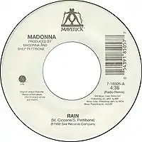 Las compañías Maverick, Sire y Warner Bros. publicaron «Rain» como el quinto sencillo internacional de Erotica —tras la canción principal, «Deeper and Deeper», «Bad Girl» y «Fever»— mientras que en Estados Unidos fue el cuarto y último, ya que «Fever» no estuvo disponible comercialmente allí.[10][11] La primera fecha de publicación fue el 17 de julio de 1993 en Europa y Australia, cuando se editó un maxi sencillo en CD,[12][13] y en Estados Unidos fue el 4 de agosto —en vinilo de 12"— y al día siguiente en CD.[10][14] El lanzamiento incluyó una pista inédita de doce minutos titulada «Up Down Suite», que es una versión dub con ritmos house de «Goodbye to Innocence» —grabada durante las sesiones de Erotica pero finalmente descartada—;[15] una remezcla hip hop de «Waiting» —también del álbum— con raps de Everlast; y dos versiones de «Rain», la original de 5:24 de duración y otra para la radio de 4:35.[10] Dichas canciones salieron al mercado en el LP de 12", en el CD y en casete.[14][16][17] En Estados Unidos también estuvo disponible otro vinilo de 7" y un casete con la versión editada de «Rain» y la original de «Waiting», sin el rap de Everlast.[18][19] En Reino Unido, «Open Your Heart» (1986) se añadió al CD y al vinilo de 12",[20] y en Alemania y Francia figuraron dos ediciones de «Fever» más las dos versiones de «Rain» en esos mismos formatos.[21] Por último, en Australia y Japón salió a la venta un EP de diez pistas que contenía remezclas y versiones editadas de «Waiting», «Bad Girl», «Up Down Suite», «Fever» y «Rain».[22] En 1995, esta última formó parte de la lista de canciones de Something to Remember, un recopilatorio de baladas de Madonna.[23]