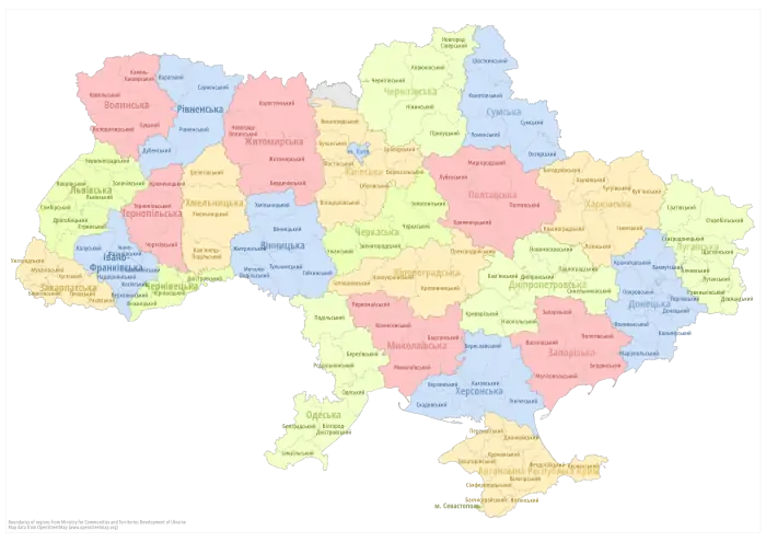 La siguiente lista muestra las divisiones de cada óblast ucraniano. Cada raión está formado por unos municipios, los que constituyen el último nivel de división administrativa. Algunas ciudades importantes están subdivididas en «raiones urbanos» , que tienen su administración local subordinada a la de la ciudad.