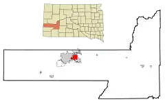 ![]() Abajo, ubicación en el condado de Pennington. Arriba, ubicación del condado de Pennington en el estado de Dakota del Sur