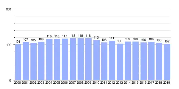 Gráfica de evolución demográfica de Rarís (parroquia) entre 2000 y 2019 |
