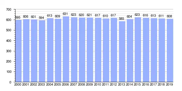 Gráfica de evolución demográfica de Rarís (aldea) entre 2000 y 2019 |