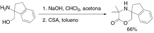 Diversos compuestos se ha reportado como productos de la síntesis de Bargellini[3] Un ejemplo es la síntesis de la 5',5'-dimetil-2,3-dihidro-6'H-espiro[indeno-1,3'-[1,4]oxazinan]-6'-ona: