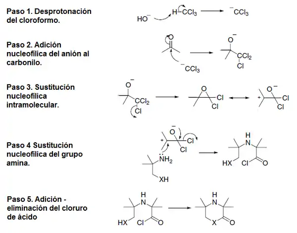 El mecanismo de reacción comienza con la desprotonación del cloroformo. El anión triclorometiluro ataca al carbonilo de la cetona, formando así el alcóxido, de una manera similar a la reacción de Grignard. El alcóxido ataca intramolecularmente al carbono trihalogenado para formar así el diclorooxirano en un mecanismo SN2 intramolecular. La amina puede atacar al oxirano debido a una formación de un carbocatión terciario en una sustitución nucleofílica SN1 con una eliminación concertada de un átomo de cloro. Así se forma un halogenuro de N-alquil-α-aminoácido. Al final, el grupo amino o hidroxilo ataca al cloruro de ácido formando el heterociclo correspondiente.[2]