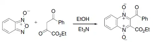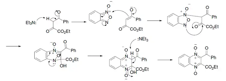 El mecanismo de reacción compienza con la desprotonación del α,γ-dicetoácido. El carbanión producido ataca al nitrógeno del N-óxido del benzofurazano, formando así un heterocíclico aniónico. Por medio del átomo de nitrógeno aniónico, este ataca en un mecanismo de adición nucleofílica al grupo α-cetona del éster, formando un derivado del 11-oxa-1,8-diazatriciclo[6.2.1.02.7]undeca-2,4,6-trieno. El aducto se rompe en para formar el derivado de la dihidroquinoxazolina, la cual recupera la aromaticidad por deshidratación del aldol formado[2]