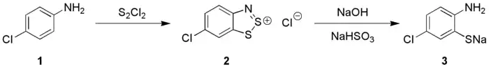 - conversión a un orto-aminotiol a través de la reacción de Herz (la anilina 5 y cloruro de diazufre),