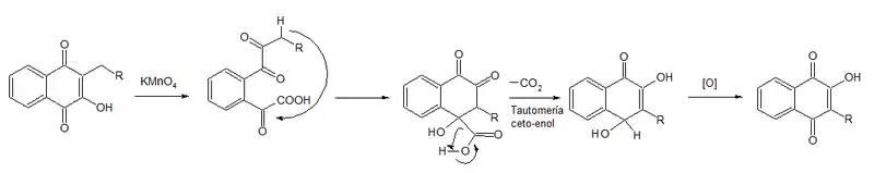 - El mecanismo consiste en la oxidación que provoca una ruptura en el grupo alqueno, seguida por una descarboxilación, y un nuevo cierre de anillo por el producto oxidado.