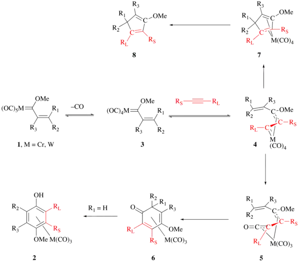 Se cree que el mecanismo inicia con la pérdida de monóxido de carbono del complejo de carbeno de Fischer 1 para dar el intermediario 3. La pérdida de CO limita la velocidad, lo que dificulta la investigación de este mecanismo de reacción. Entonces el alquino se coordina con el centro del metal, en un proceso de barrera energética baja. El complejo resultante con el alquino transpone al intermediario 4.[12] El complejo η1, η3 mostrado como 4 posteriormente experimenta la inserción de CO para dar el complejo η4-vinilcetena 5, el cual experimenta electrociclización para formar el intermediario 6. Cuándo R1 es hidrógeno, el intermedio 6 es de vida corta y procede la formación del complejo al metal del tricarbonil areno 2. Sin la inserción de CO , la reacción procede a través de 7 al derivado del ciclopentadieno 8.