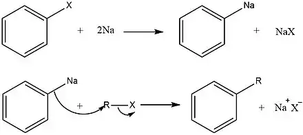La reacción funciona mejor para formar productos asimétricos si los reactivos de haluro están separados de alguna manera en sus reactividades químicas relativas. Una forma de lograr esto es formar los reactivos con halógenos de diferentes periodos. Por lo general, el haluro de alquilo se vuelve más reactivo que el haluro de arilo, lo que aumenta la probabilidad de que el haluro de alquilo forme primero el enlace organosódico y, por lo tanto, actúe más eficazmente como nucleófilo hacia el haluro de arilo.[8] Normalmente, la reacción se utiliza para la alquilación de haluros de arilo; sin embargo, con el uso de ultrasonido, la reacción también puede ser útil para la producción de compuestos de bifenilo.[9]