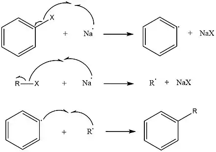 Hay dos enfoques para describir el mecanismo de la reacción de Wurtz-Fittig.[10][11] El primero implica la formación mediada por sodio de radicales alquilo y arilo. Los radicales alquilo y arilo luego se combinan para formar un compuesto aromático sustituido.