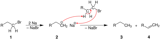 Para que esta reacción parásita se produzca, se requiere de un hidrógeno β en el radical alquilo del haloalcano (1). El carbanión (2) tiene un carácter básico fuerte y puede arrancar un protón de otro haloalcano, que luego eliminará su átomo de halógeno. Esta reacción produce un alcano (3) y un alqueno (4).