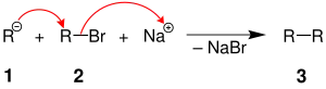 Se trata simplemente de la reacción de Wurtz del haloalcano sobre sí mismo: acoplamiento del carbanión (1) con el haloalcano del que deriva (2), produciendo un alcano superior (3).