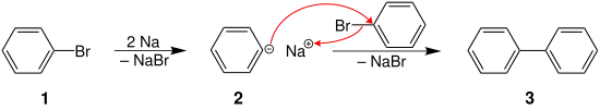 Alternativamente, el acoplamiento parásito puede darse entre dos haluros de arilo (1). El carbanión aromático (2) formado reacciona con otro haluro de arilo, produciendo un biarilo (3). Sin embargo, esta reacción es rara debido a la baja reactividad de los haluros de arilo.[12]