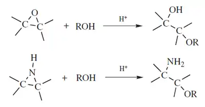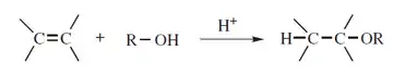 La adición de alcoholes a dobles ligaduras puede ser catalizada por ácidos. El mecanismo es electrofílico, en donde el enlace π es atacado por el protón ácido. Al formarse el carbocatión, el alcohol se adiciona por el mecanismo de SN. La adición sigue la Regla de Markovnikov. Los alcoholes primarios dan mejores resultados que los secundarios y los alcoholes terciarios son muy inactivos. La adición de alcoholes a sistemas alílicos puede proceder con transposición y el uso de un aditivo quiral puede llevar a una inducción asimétrica.[25] La adición intramolecular de alcoholes a alquenos puede ser promovida por un catalizador de paladio, en donde la doble ligadura puede migrar en el producto final.[26] Los compuestos de renio,[27] de titanio[28] o de platino[29] facilitan la ciclización de anillos de tetrahidrofurano. Los alcoholes alílicos se pueden convertir en 2-bromooxetanos empleando Br(colidina)2+ PF6.[30]