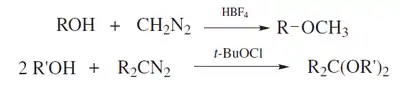 Los alcoholes reaccionan con diazocompuestos para formar éteres, pero el diazometano y las diazocetonas reaccionan con mayor facilidad, produciendo así metiléteres o α-cetoéteres respectivamente[14] Con diazometano el método es costoso y requiere precauciones, pero las condiciones son moderadas y tiene altos rendimientos.[15] El diazometano por lo general es utilizado para metilar alcoholes que pueden presentar reacciones indeseadas. Los alcoholes ordinarios reaccionan en presencia de catalizadores tales como HBF4 (HF/BrF3)[16] o sílica gel.[17]