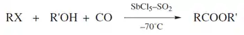 Varios métodos, basados en el empleo del monóxido de carbono o carbonilos metálicos, han sido desarrollados por conversión de halogenuros de alquilo en presencia de un alcohol para formar ésteres[31] Las condiciones más empleadas son en presencia de pentacloruro de antimonio y bióxido de azufre. El cloruro de antimonio promueve la formación del carbocatión y el par electrónico del carbeno del monóxido de carbono lo ataca. El alcohol ataca al carbonilo correspondiente.