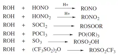 Los alcoholes pueden formar ésteres con ácidos inorgánicos (como el ácido sulfúrico, ácido nítrico o ácido fosfórico) o sus respectivos cloruros de acilo (Cloruro de fosforilo, cloruro de sulfurilo o fosgeno)