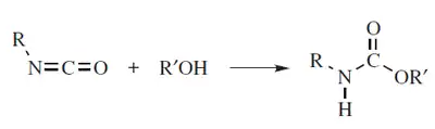 Se pueden preparar carbamatos empleando alcoholes y un isociatato de alquilo. Es una reacción de amplio espectro y que produce buenos rendimientos. La adición de un segundi equivalente produce un alofanato.[35]
