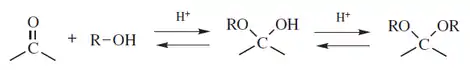Los acetales y cetales se preparan a partir de la acetona o aldehído correspondiente y un alcohol, en presencia de ácido mineral. La reacción está en equilibrio marcado, así que se utilizan condiciones que favorezcan la formación del producto acetálico, por ejemplo, haciendo uso de la ley de acción de masas. El mecanismo de formación de acetales se cataliza con medio ácido. Esta reacción es en dos etapas, llevadas a cabo en el mismo reactor. En la primera, el compuesto carbonílico reacciona con una cantidad equivalente de alcohol, en un equilibrio ácido-base por un mecanismo de adición-eliminación para formar un hemiacetal (o hemicetal, según sea aldehído o cetona). El hemiacetal se protona posteriormente para formar el acetal otra vez por un mecanismo adición-eliminación.