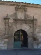 Las tres portadas de piedra, situadas dos de ellas en el centro de los hastiales, y una tercera en la fachada suroeste, también en posición centrada, presentan una composición análoga, con columnas o pilastras, recuadrando un arco, en cuyos lados lucen las armas de la villa; en la parte superior, un frontón con el escudo real.