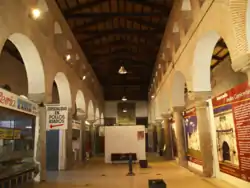 Interiormente el edificio, de planta rectangular y cubierta inclinada a cuatro aguas, se divide en tres naves, a modo de lonja, mediante arquerías de columnas toscanas, que sirven de sostén al muro de ladrillo, aligerado mediante una sucesión de huecos de arco rebajado, realizados en ladrillo a sardinel, que servían de ventilación entre las naves.