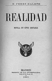Realidad es un libro basado en el del escritor español Benito Pérez Galdós publicada en 1889,[1] que cierra el ciclo de las "Novelas españolas contemporáneas" junto con La incógnita, escrita también en 1889. Ambas obras conforman un microcosmos planteando el mismo problema desde puntos de vista diferentes y con recursos narrativos distintos.[2] Podría decirse que Realidad es la opción teatralizada o dialogada del argumento que, presentado en forma epistolar, trata La incógnita. Así lo han considerado tanto Joaquín Casalduero como Francisco Caudet.[3][4]
