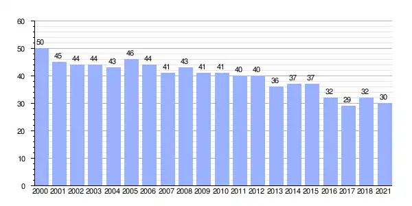 Gráfica de evolución demográfica de Reboredo entre 2000 y 2021 |