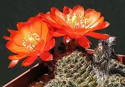 Es una planta perenne carnosa, globosa de color verde armada de espinos y con las flores de color naranja y amarillo.