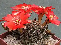 Es una planta perenne carnosa, globosa de color verde armada de espinos y con las flores de color rojo y amarillo.