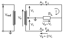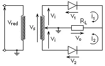 En el circuito de la figura, ambos diodos no pueden encontrarse simultáneamente en directa o en inversa, ya que las diferencias de potencial a las que están sometidos son de signo contrario; por tanto uno se encontrará polarizado inversamente y el otro directamente. La tensión de entrada (Vi) es, en este caso, la media de la tensión del secundario del transformador.