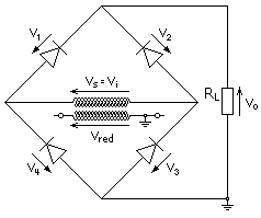 En este caso se emplean cuatro diodos con la disposición de la figura. Al igual que antes, solo son posibles dos estados de conducción, o bien los diodos 1 y 3 están en directa y conducen (tensión positiva) o por el contrario son los diodos 2 y 4 los que se encuentran en directa y conducen (tensión negativa).
