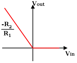 Una alternativa a la versión simple se muestra en la figura 2. En dicho caso, cuando la entrada es mayor a cero, el diodo es polarizado en inversa pero el diodo es polarizado en directa, por lo que la salida es igual a cero. Por otra parte, cuando la entrada es negativa los diodos cambian de roles y la salida posee la misma forma que la entrada pero con una amplificación de .[5] La característica de transferencia de la entrada y salida se muestra en la siguiente gráfica.[4]