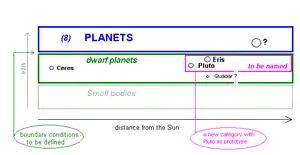 El término "planeta menor" se habría abandonado, reemplazándolo por las categorías "cuerpo pequeño del sistema solar" y una nueva clasificación, "plutones". La primera habría definido a los cuerpos por debajo del umbral de esfericidad. La última habría definido a los planetas con órbitas muy inclinadas, alta excentricidad, y un periodo orbital de más de 200 años, es decir, los cuerpos que orbitan más allá de Neptuno. Plutón sería el "plutón"[nota 1] arquetípico. El término "planeta enano", que se habría podido usar para describir a todos los planetas más pequeños que los ocho "planetas clásicos" en órbita alrededor del Sol, no es una clasificación oficial de la UAI.[5] La UAI no recomendó este borrador que separa a un planeta de una enana marrón.[6] La decisión final sobre si se aceptaba este borrador se preveía para el 24 de agosto de 2006.[7]