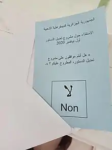 El referéndum constitucional de Argelia de 2020 se celebró el 1 de noviembre de 2020.[1] El tema del referéndum fue una revisión de la constitución argelina , y sigue a una serie de protestas conocidas como Hirak.