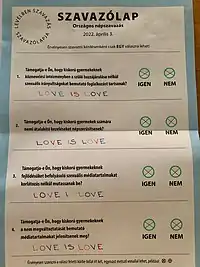 Una declaración conjunta de 10 grupos húngaros LGBT+ y de derechos humanos, incluidos Budapest Pride y Amnistía Internacional Hungría, pidió a los ciudadanos que den respuestas inválidas al referéndum, marcando cada círculo de las opciones "sí" y "no" en cada pregunta para "ayudar a garantizar que el referéndum excluyente del gobierno no alcance el umbral de validez".[11]