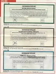Derogación de las normas que permiten la concentración de dos cadenas de televisión. Promovido por miembros de algunas asociaciones de voluntariado, de promoción ambiental y cultural como el Mo.V.I. (Movimiento Voluntario Italiano), Legambiente, ACLI y ARCI; los primeros firmantes y presentadores fueron los secretarios nacionales o los presidentes de estas asociaciones.[7]