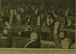 Después de que la UCRI se retirara y se rechazaran las impugnaciones a la Convención que exigían el reconocimiento de la Constitución de 1949, la asamblea pasó a tratar la cuestión del efecto de la proclama del dictador Aramburu, restableciendo el texto constitucional de 1853, con las reformas de 1860, 1866 y 1898. Sin embargo tampoco había acuerdo entre los partidos que sostenían la vigencia de la Constitución de 1853, presentándose dos despachos.[19] La UCRP y los conservadores sostenían que la Constitución de 1853 había comenzado a regir desde la proclama de Aramburu del 27 de abril de 1956, y que la Convención sólo debía ratificar su vigencia. Otro sector, en el que se encontraban los partidos Socialista y Demócrata Progresista, sostenía que el gobierno de facto no tenía facultades para establecer la Constitución y que el país se encontraba en ese momento sin Constitución, siendo deber de la Convención establecer su vigencia. Finalmente ambos sectores llegaron a un texto de consenso, mediante el cual la Convención Constituyente, el 23 de septiembre dictó su primera norma constitucional, rechazando las impugnaciones y "declarando" que la Constitución de 1853 se encontraba vigente:[6]