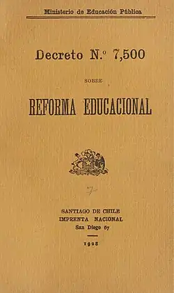 Se puede caracterizar la educación chilena por su extranjerización,[nota 5] lo que significó una tendencia intelectual y verbalista, antes que práctica. Originando una relación pedagógica autoritaria y dogmática, con tareas mecánicas y de memorización por efecto de repetición de textos.[cita 2] Los criterios para iniciar esta reestructuración en un principio fueron un punto de unión entre los protagonistas, ya que era urgente un cambio fundamental, pero al momento de realizarse la Asamblea Pedagógica en 1926, allí se contactaron visiones entre la Asociación General,[nota 6] esta defendió la necesidad de una plena integración del servicio educativo, mientras que la mayoría de la Asamblea prefería una compleja diferenciación de ramas aunque ligadas por la acción coordinadora de una Superintendencia de Educación.[nota 7] La minoría de maestros primarios quería una reforma pronta y simultánea; sus antagonistas, una reforma gradual, apoyada en actividades de investigación y experimentación y una previa reestructuración de los organismos administrativos. Seguido se esto, el Ministro Aquiles Vergara Vicuña [nota 8] firma junto al presidente uno de los primeros decretos.[nota 9] La reforma constitucional tiene dos principales fundamentos de índole socio-política: primero el movimiento social pro-renovación educativa encabezado por la Asociación General de Profesores, que se expresa teóricamente en el “plan de reconstrucción educacional”; y segundo los objetivos políticos y el contenido programático del gobierno reformista y modernizador.[nota 10] En los aspectos pedagógicos, hubo clara inspiración en el pensamiento educacional a través de esta los principios y métodos de la educación nueva, y más específicamente de la “escuela activa”, que venían formándose y enseñándose en Europa, en los Estados Unidos y algunos países de Latinoamérica.[nota 11] Así mismo la versión oficial de este mismo plan, presentada a la asamblea pedagógica de 1926, se indican dos leyes científicas en las que se basaba la propuesta reformadora: la Ley del progreso humano[nota 12] y la Ley biogenética. La nueva educación se basa en el conocimiento científico del niño. A este respecto, el proyecto citado menciona y describe brevemente, cinco etapas que “caracterizan los distintos períodos del desarrollo del ser humano desde el punto de vista de los intereses que predominan en él, en la edad en que la educación ha de atender de sus necesidades.[nota 13]