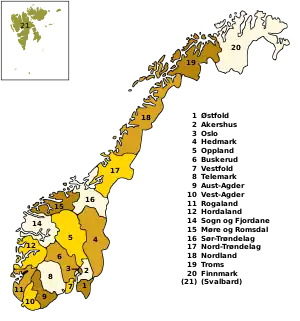 Se crearon seis nuevos condados mediante la fusión de 13 condados preexistentes el día 1 de enero de 2020: Viken (antes Buskerud, Akershus y Østfold), Innlandet (antes Oppland y Hedmark), Vestfold y Telemark (antes Vestfold y Telemark), Agder (antes Vest-Agder y Aust-Agder), Vestland (antes Sogn og Fjordane y Hordaland) y Troms y Finnmark (antes Troms y Finnmark).
