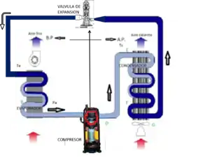El dispositivo de expansión provoca una caída repentina de la presión y la temperatura sin intercambio de calor, por lo que esta parte del proceso se puede considerar, idealmente, como una transformación adiabática o isoentálpica. El fluido todavía en estado líquido y a la presión de vaporización penetra en el evaporador, intercambiador de calor ubicado en el medio que se pretende enfriar, del cual absorbe la energía térmica correspondiente al calor latente de vaporización, de forma que el fluido sale del evaporador completamente en estado de vapor. La transformación se puede considerar isotérmica por la misma razón que se dio en el condensador. El tramo del circuito desde la válvula de expansión hasta el compresor se conoce como lado de baja o zona de baja presión. A continuación, el vapor es aspirado por el compresor para iniciar de nuevo el ciclo.