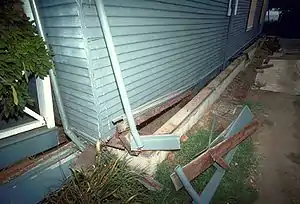 Estructuras residenciales de uno o dos pisos construidas con armazón de madera sobre un perímetro o cimientos de rocas se encuentran relativamente seguras en un terremoto, per en muchas estructuras construidas antes del 1950 la placa radier ("sill plate") que se encuentra entre los cimientos de concreto y el diafragma del piso (cimientos del perímetro) o unos espesos cimientos de roca ("studwall") puede no haber sido atornillada en modo suficiente. Adicionalmente, los tornillos o las estructuras de conexión entre la madera y la roca (que no hayan sido substancialmente protegidas de la corrosión) pueden haberse corroído hasta un punto de debilidad. Un sacudón lateral puede hacer deslizar el edificio enteramente fuera de los cimientos o de las rocas macizas.