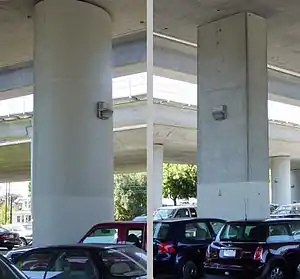 Una forma simple de retrofit es la de rodear la columna con una espesa banda o "camisa" de láminas de acero que son fundidas y soldadas hasta que forman un único cilindro. Ulteriormente el espacio entre la camisa y la columna será rellenado con concreto, en un proceso que en inglés de denomina "grouting". Cuando el suelo o las condiciones de la estructura necesitan de esta modificación adicional, ulteriores pilares pueden ser aplicados cerca de la base de la columna y plataformas de concreto que unen los pilares al pilón serán fabricadas en el nivel del suelo o bajo este. En el ejemplo mostrado no todas las columnas necesitaban ser modificadas para ganar una resistencia sísmica suficiente para resistir las condiciones esperadas. (Esta localidad se encuentra a como una milla de la falla de Hayward.)
