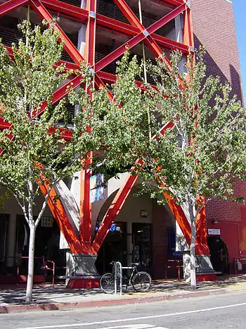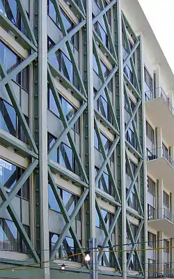 Aquí se muestra un refuerzo externo a capa o estructura portante (shear trusses) de un edificio convencional (un dormitorio) realizado precedentemente en concreto armado y ladrillos. En este caso, hay suficiente resistencia vertical en las columnas del edificio y suficiente resistencia frente a esfuerzo cortante en los pisos bajos, cosa que permitió un refuerzo externo para aumentar su resistencia en terremotos. Edificio localizado cerca de la falla de Hayward.