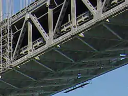 Los puentes colgantes pueden responder a los terremotos con un movimiento lado-a-lado que excede aquel que fue proyectado para la respuesta a los vientos. Este movimiento puede causar fragmentación de la superficie del terreno, daños a los rodamientos, y la deformación plástica o la ruptura de los componentes. Se pueden añadir dispositivos como amortiguadores idraulicos o conexiones deslizantes "clampadas" y otros refuerzos adicionales diagonales.