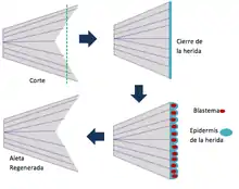 En la regeneración de aleta, la epidermis controla el estado de diferenciación celular. Luego de realizada la escisión, se da una rápida contracción del epitelio alrededor de la herida mediada por F-actina. Cuanto ese proceso de cierre mediado por la actina finaliza, las células epiteliales de la herida migran para formar la epidermis de la herida (wound epidermis)[20] en esta capa epidérmica de expresa la β-catenina, cuyo trabajo consiste en mantener relaciones intercelulares y facilitar la migración.[19] Las células de esta capa epidérmica tienen una identidad diferente a la de las células epidérmicas de su alrededor.[20] Se han realizado diferentes estudios donde se evaluó la importancia de esta capa epidérmica. Se ha descubierto que si esta capa epidérmica es extraída, el proceso de regeneración será detenido. Bajo dicha capa empieza a formarse el blastema. Sobre la naturaleza de esta masa celular se manejan dos hipótesis: la primera plantea que el blastema se forma a partir de un conjunto de células madre en estado latente que se activan cuando se realiza la amputación; la segunda plantea que el blastema se origina a partir de células mesenquimáticas que sufren un dediferenciación.[20] Actualmente se apoya la segunda hipótesis. De acuerdo con lo anterior, luego de dediferenciarase, las células del blastema sufren nuevamente una diferenciación para reemplazar los tejidos removidos.[18] La transición del estado de blastema al estado de extensión presenta cambios tanto morfológicos como moleculares, dentro de estos últimos se encuentran cambios en la expresión de diferentes genes en los dos estadios así como la expresión de nuevos genes. Durante la formación del blastema la expresión del factor de crecimiento fibroblástico de la herida (wfgf) es baja, mientras que en la etapa de extensión es mucho mayor; wnt3a no se expresa durante la formación del blastema pero sí en la extensión.[19] El blastema está dividido en tos zonas: distal y proximal. Se presume que en la zona proximal es donde se da la diferenciación de las células mesenquimáticas[19] aunque aún no se sabe con certeza cómo se da este proceso.